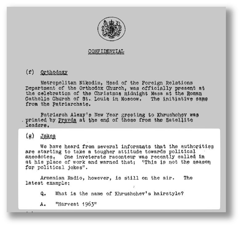 Question to Radio Armenia:“Is it possible to build Communism in a randomly taken capitalist country, for example, Holland?”Answer:“It’s possible, but what did Holland ever do to you?” In his bilingual compendium of Soviet underground jokes Forbidden Laughter, Emil Draitser makes the pointed, if ironic, observation that “The anecdote in the Soviet Union substitutes for lots…